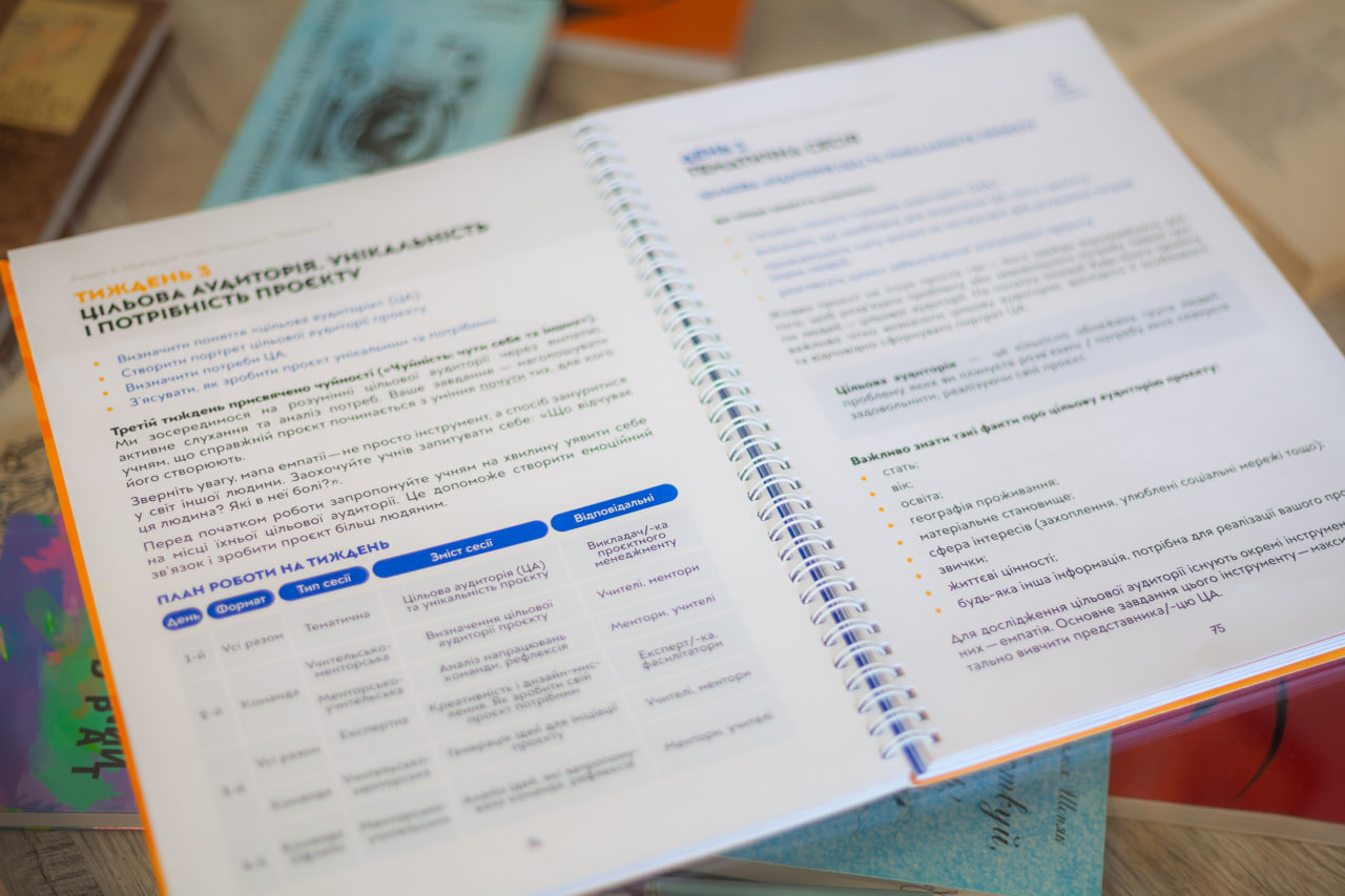 - Основна частина гайдбуку — це структурована освітня програма на 15 тижнів.