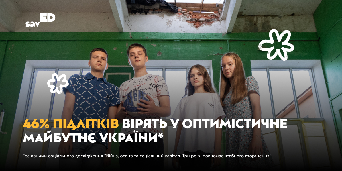 З-поміж учнів 8–11-х класів, їхніх батьків, учителів та представників шкільних адміністрацій саме підлітки найменш оптимістично налаштовані щодо майбутнього України. 46 % з них вірять у майбутнє країни, 16 % — песимістично налаштовані, 33 % — не визначилися. Водночас більш оптимістично налаштовані учителі та представники адміністрацій — 67 % і 88 % відповідно. Про це свідчать результати соціального дослідження «Війна, освіта та соціальний капітал. Три роки повномасштабного вторгнення», яке провів Міжнародний благодійний фонд savED у 2025 році.