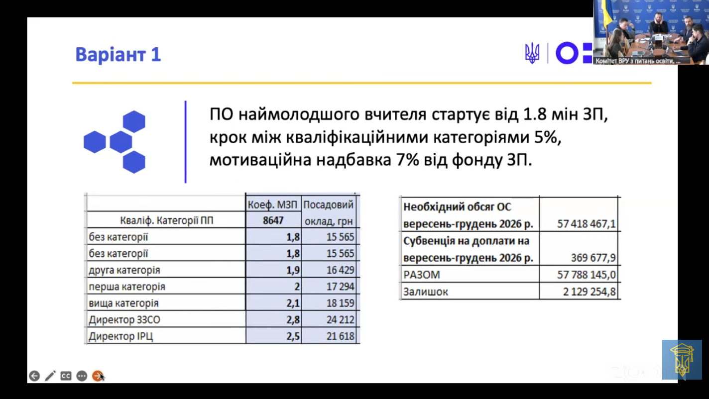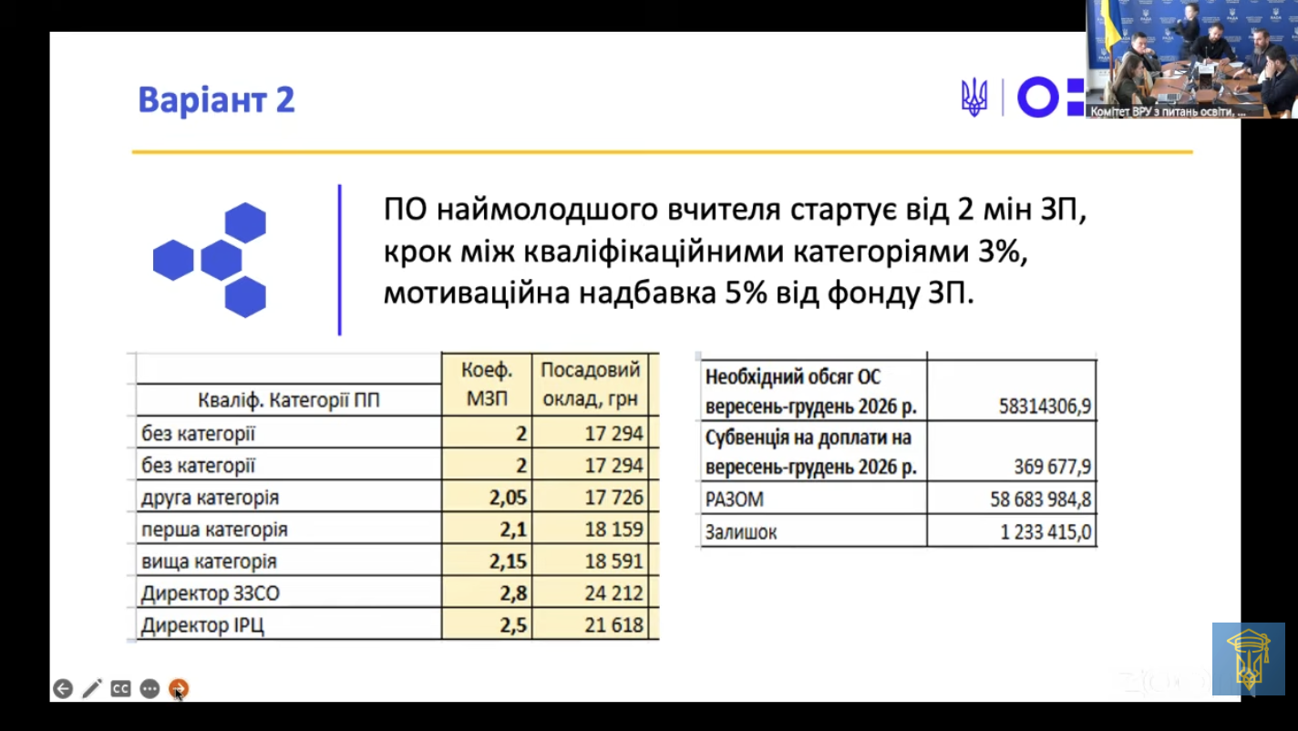 У МОН розглядають два варіанти нової системи. В одному з них стартовий оклад молодого вчителя може становити 1,8 мінімальної зарплати з кроком зростання між категоріями 5 %. В іншому — від 2 мінімальних зарплат із меншим кроком підвищення, але більш стабільною структурою.