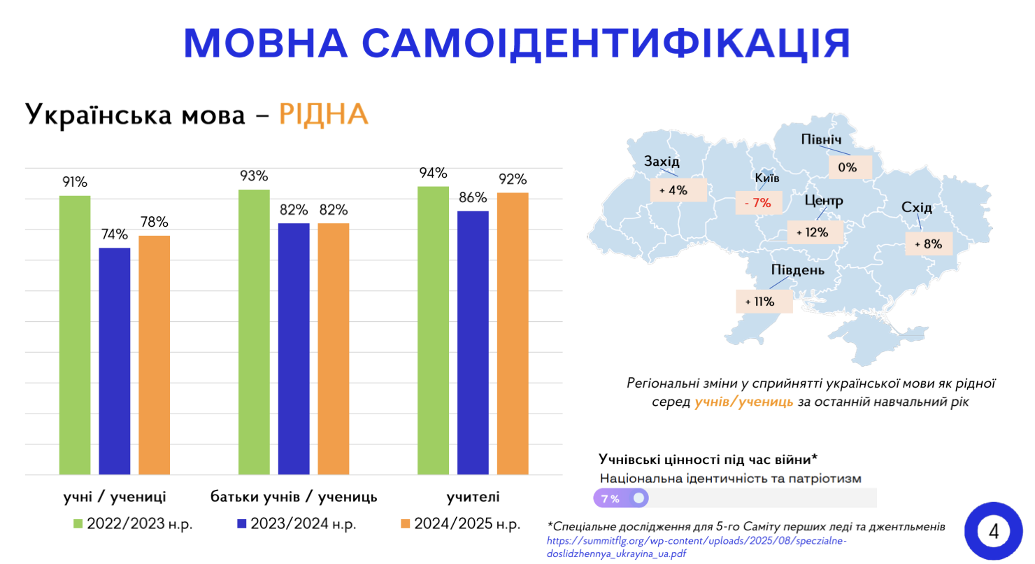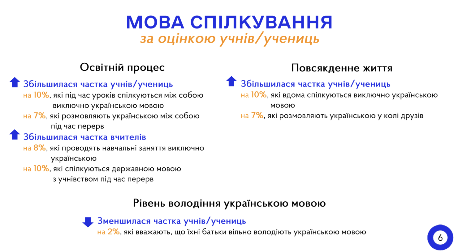 Також більше дітей почали спілкуватися виключно українською — вдома (49 %, +10 %) та поза школою (44 %, +7 %).