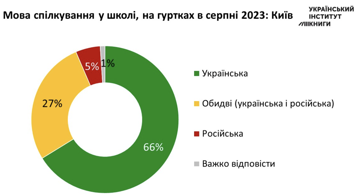 Інна Волосевич, заступниця директора в дослідницькій агенції Info Sapiens, згадала інше дослідження, зокрема опитування Info Sapiens для Українського інституту книги (2023), що показує зовсім іншу картину: 66 % дітей у Києві розмовляють у школі виключно українською, лише 5 % — виключно російською.