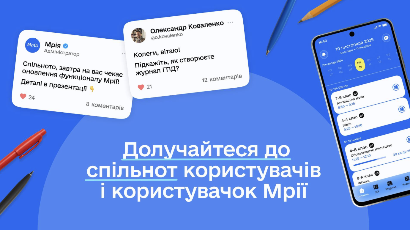 У першій спільноті педагоги/ні зможуть дізнаватися більше про функціонал Мрії, ставити запитання, ділитися досвідом і долучатися до тестування нових можливостей платформи. Приєднатися можна за посиланням.