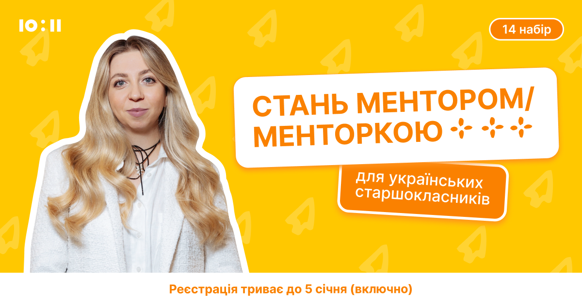 Національна безплатна «Програма менторства 10:11» відкрила реєстрацію на 14-й набір менторів та менторок для старшокласників/ць. Учасники/ці програми три місяці працюватимуть з учнівством із різних регіонів України та допомагатимуть молоді розширити світогляд і здобути нові навички, що будуть корисними в майбутній кар’єрі.