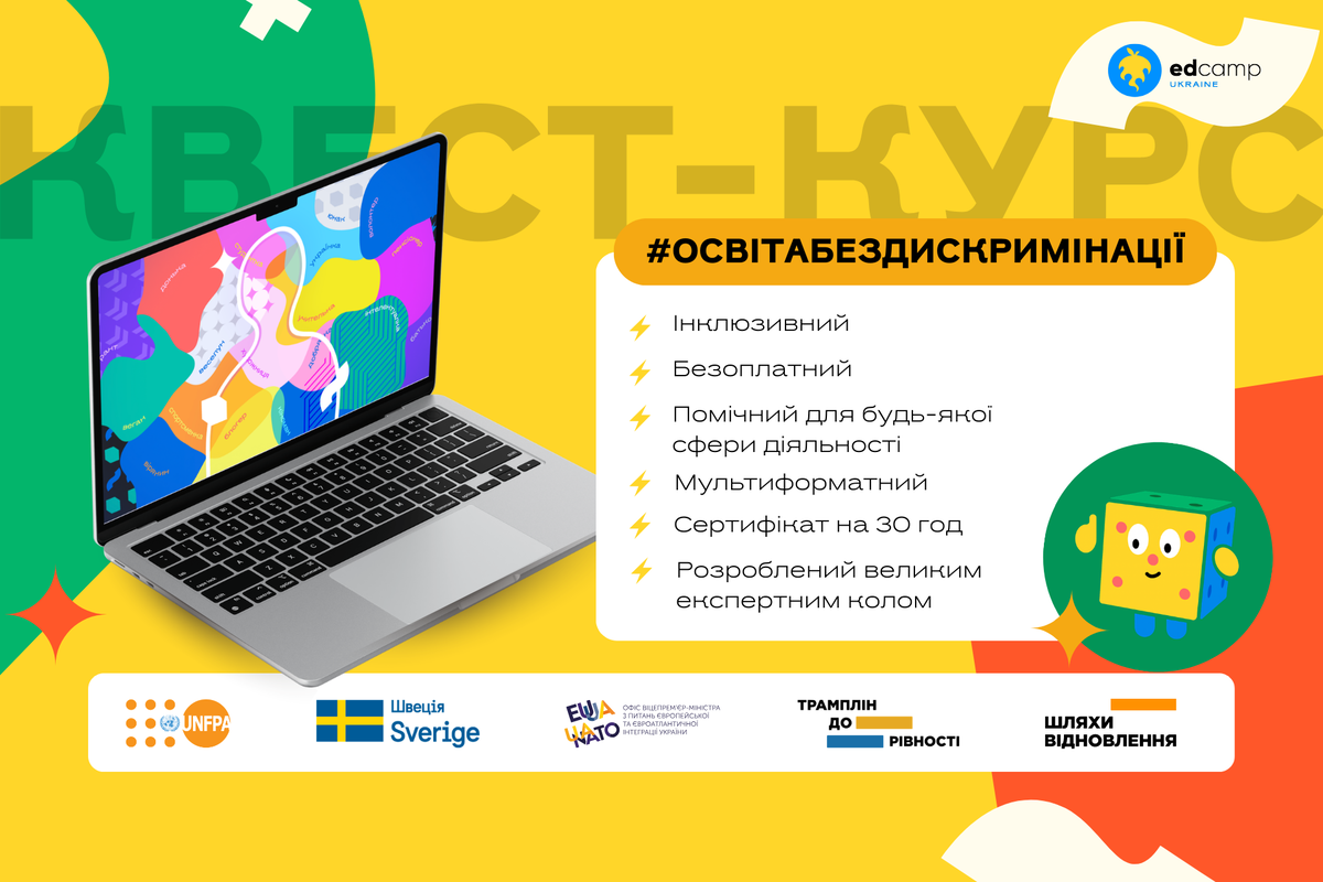 Освітян та освітянок запрошують на безплатний онлайн-курс «Освіта без дискримінації», який розробила громадська організація «EdCamp Ukraine» у межах програми MYRP, повідомили «Вчися.Медіа» організатори. Він повністю відповідає державним професійним стандартам (2020–2024 роки) та охоплює рівні дошкільної, загальної середньої, позашкільної та спеціалізованої освіти.