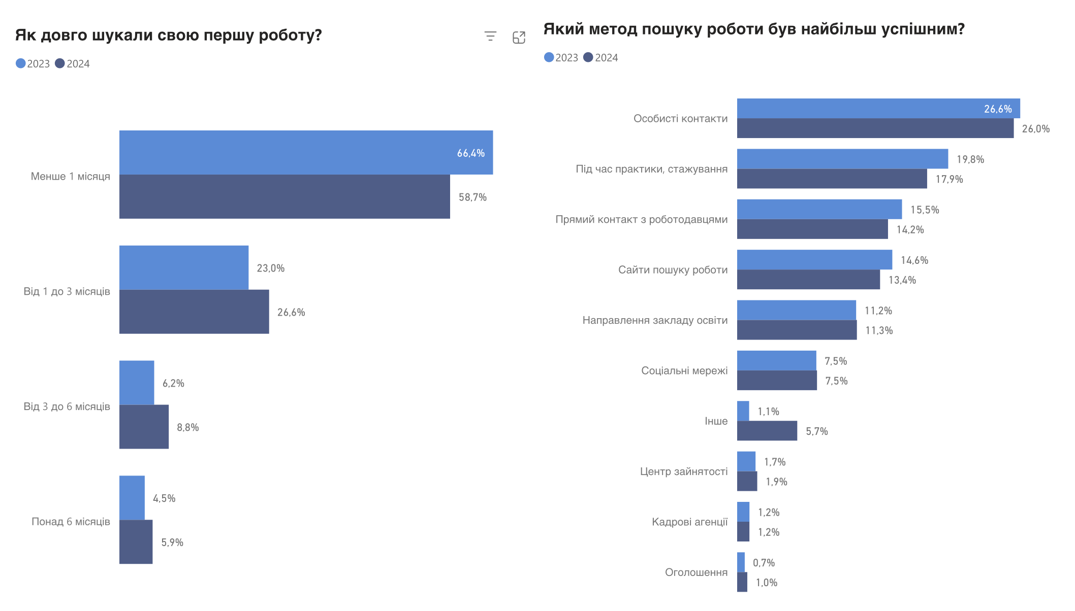 Локація: переважна більшість (67 %) обирає для роботи регіон, де проходило навчання. Але міграційний відтік за кордон порівняно з 2023 роком зріс майже вдвічі.