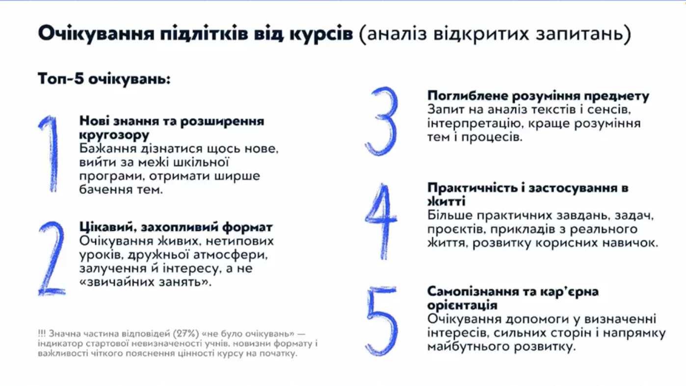Серед основних очікувань підлітків — нові знання поза межами шкільної програми, цікавий формат занять, глибше розуміння тем, практичне застосування знань у житті та самопізнання. Водночас 27 % учнів та учениць не мали чітких очікувань, що, за словами команди проєкту, свідчить про потребу кращої комунікації щодо змісту курсів.