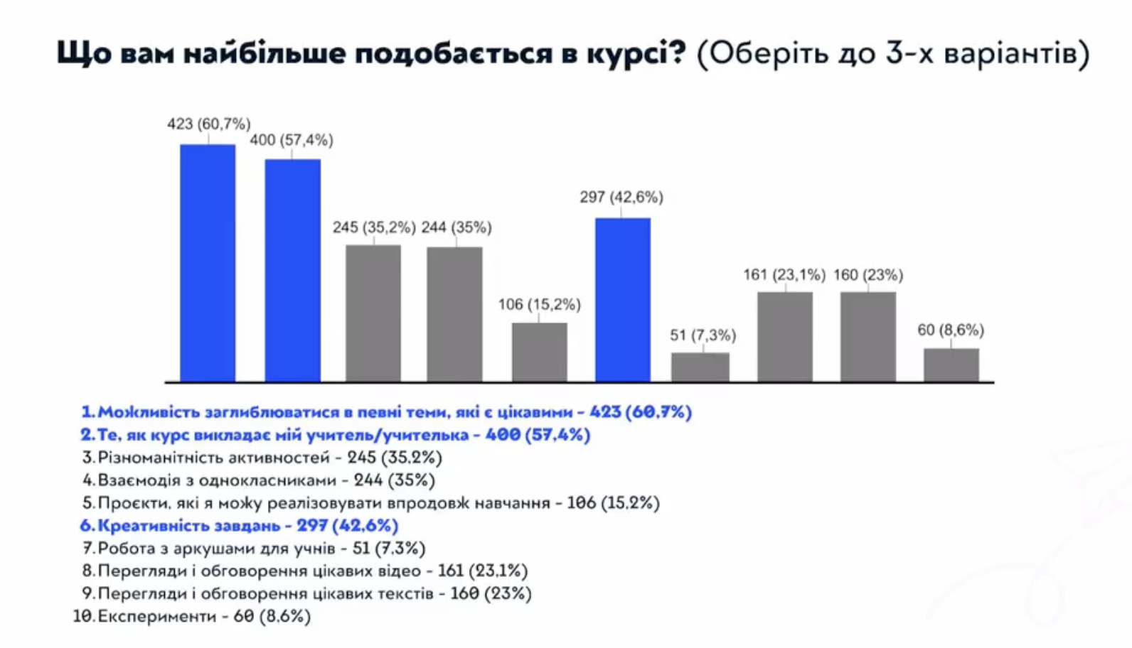 Середній рівень зацікавленості курсами учні/иці оцінили у 8,1 бала з 10. Найбільше їм подобається можливість заглиблюватися в цікаві теми, стиль викладання вчителя чи вчительки та креативні завдання.