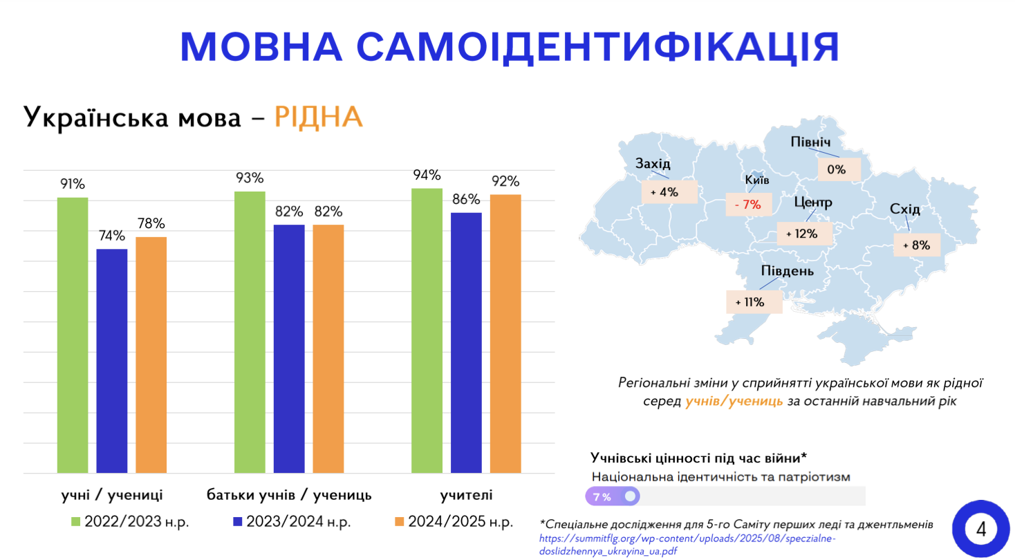 Моніторинг засвідчив позитивну динаміку українськомовної самоідентифікації серед учнів/иць, педагогів/инь і батьків. Зокрема, зросла частка вчителів/ок, які використовують українську мову не лише на уроках, а й у позаурочному спілкуванні. У східному й південному макрорегіонах на 16-17% більше вчителів/ок спілкуються українською під час перерв.