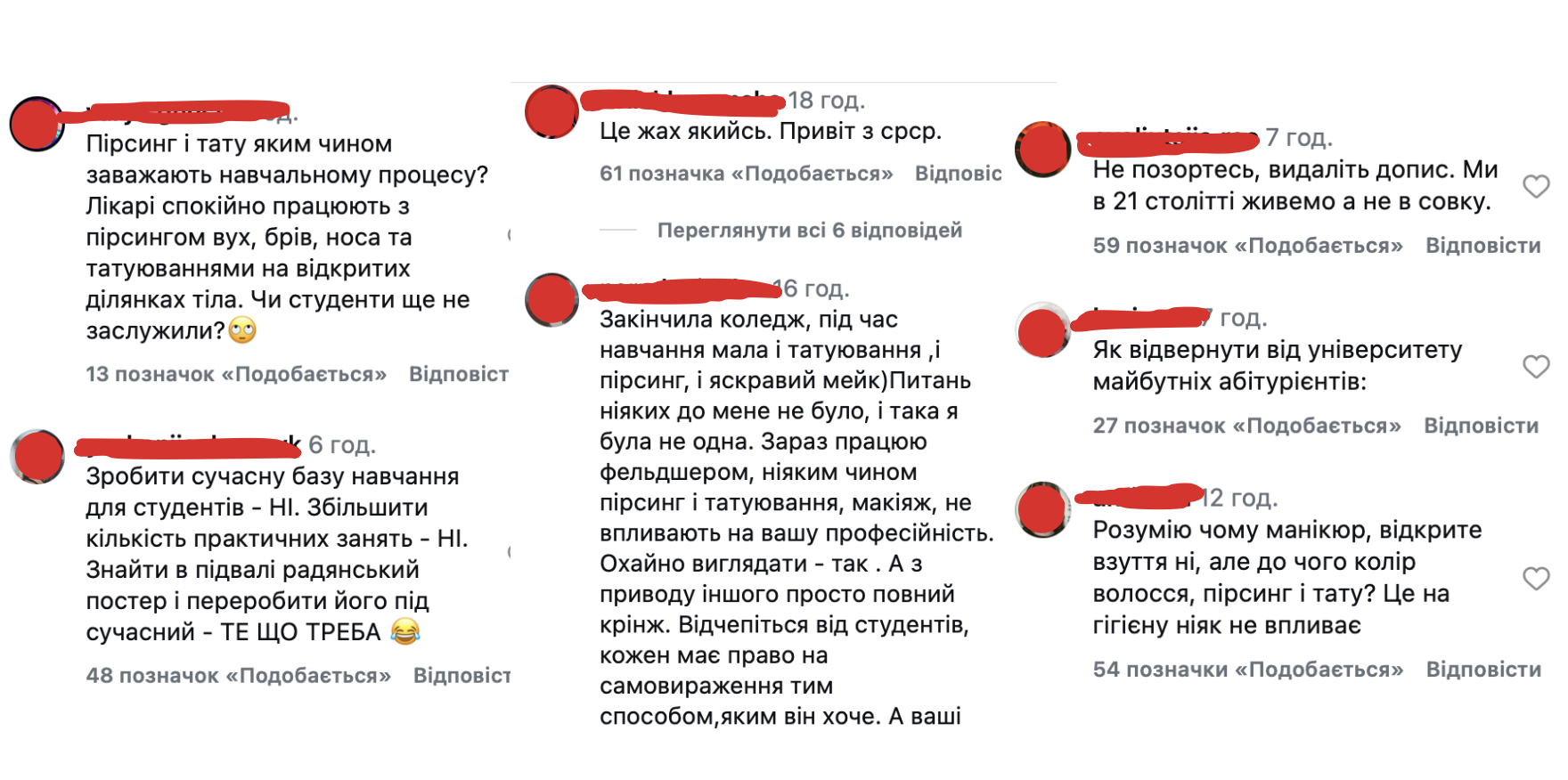 У коментарях користувачі/ки писали про застарілий і дискримінаційний підхід, а також про повернення до СРСР. Дехто зауважив, що колір волосся, татуювання чи пірсинг не впливають на професійність медпрацівника/ці та не заважають навчанню. Частина дописувачів/ок навела приклади медиків, які вже успішно працюють за професією, але при цьому мають татуювання та пірсинг. Водночас подібні публікації можуть відштовхнути абітурієнтів/ок від вибору цього закладу освіти.