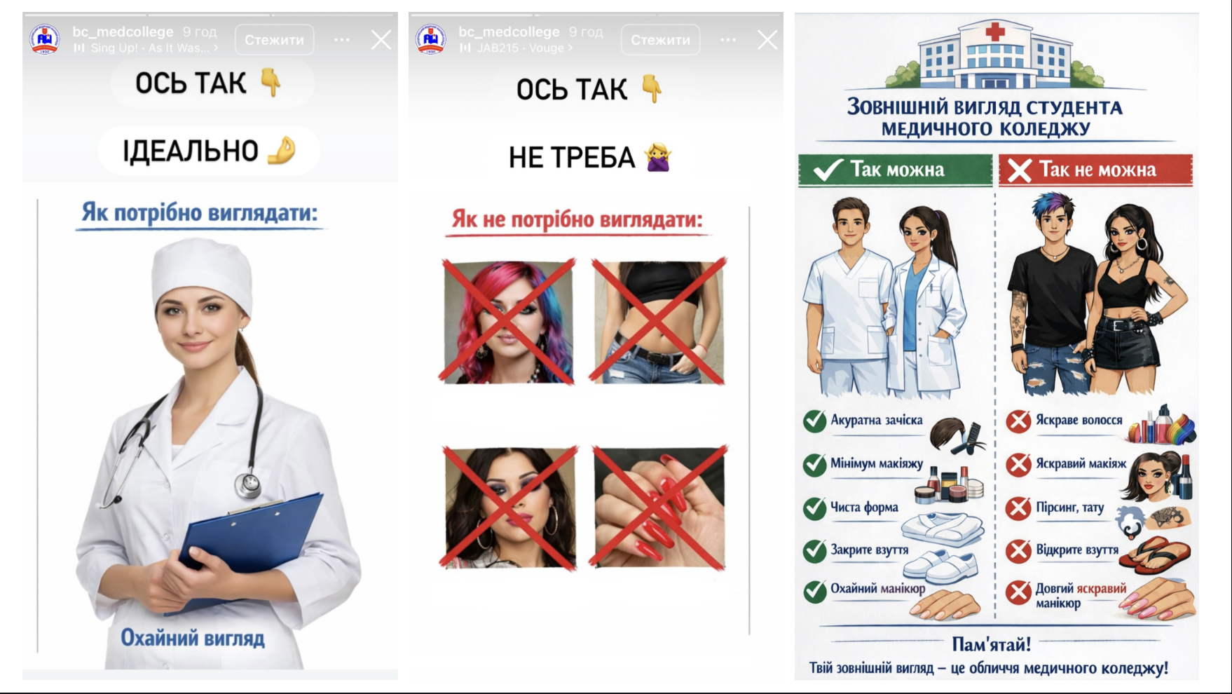 Коледж розмістив у соцмережах серію візуальних матеріалів із порадами щодо зовнішнього вигляду студентів та студенток. На зображеннях подано приклади «як можна» і «як не можна» виглядати майбутнім медикам та медикиням. Серед небажаних елементів вказані яскраве фарбоване волосся, пірсинг, татуювання, яскравий макіяж, довгі нігті та відкрите взуття. Натомість коледж рекомендує охайну зачіску, мінімальний макіяж, чисту форму та закрите взуття.