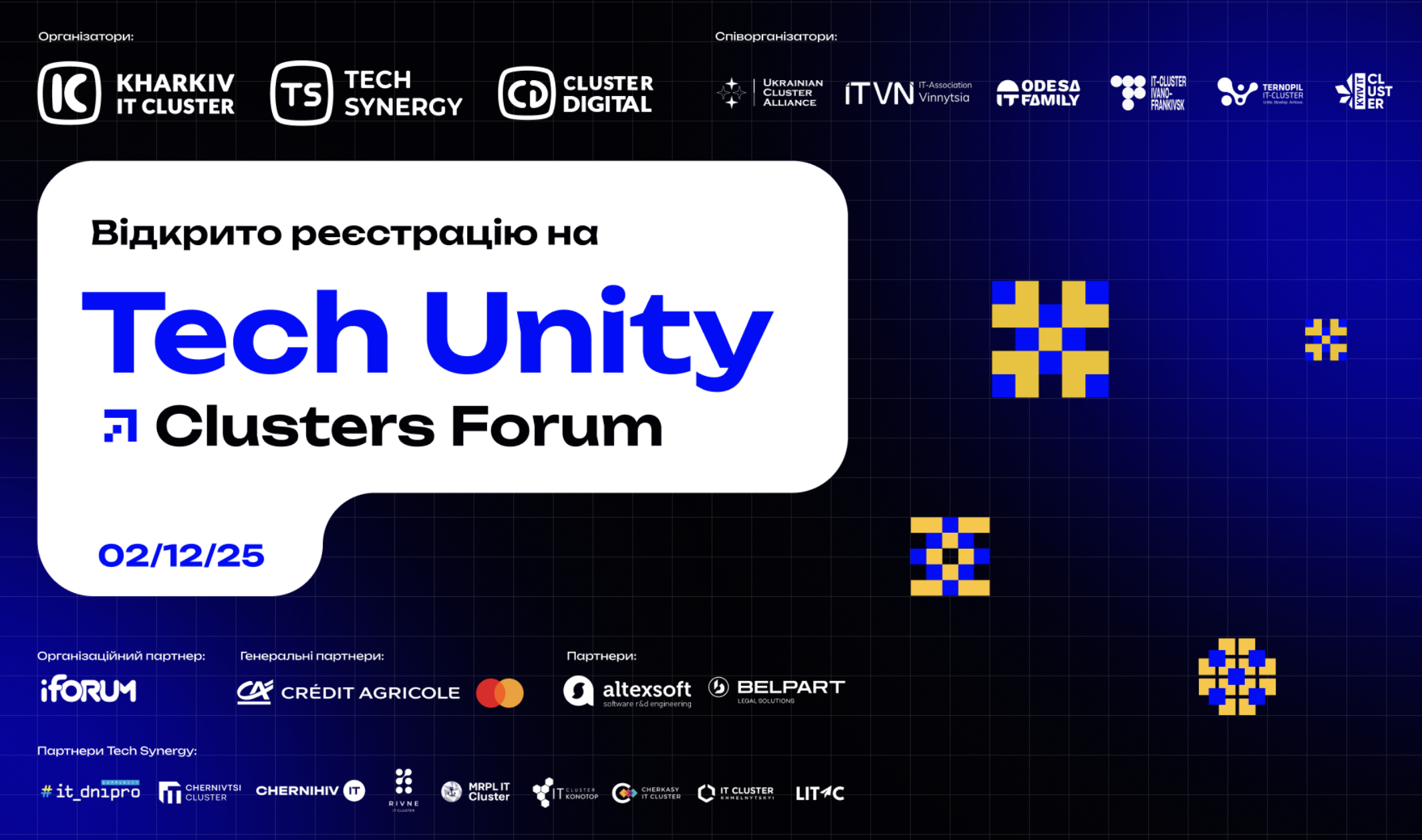 У Києві 2 грудня у Мистецькому арсеналі відбудеться Tech Unity: Clusters Forum — перший загальноукраїнський захід, який збере на одному майданчику всі IT-кластери країни, а також представників бізнесу, держави, інвесторів та освітніх інституцій, повідомляють організатори для «Вчися.Медіа». Форум стане платформою для узгодження рішень, що визначатимуть розвиток технологічної екосистеми у 2026 році. Всі внески учасників/ць є благодійними й будуть спрямовані на підтримку Сил оборони України та розвиток кластерного руху.
