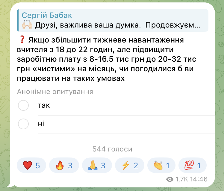 Голова Комітету Верховної Ради з питань освіти, науки та інновацій Сергій Бабак звернувся до педагогів і педагогинь пройти опитування щодо можливої зміни умов оплати праці. Він пропонує збільшення тижневого навантаження при суттєвому підвищенні зарплат.