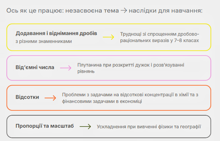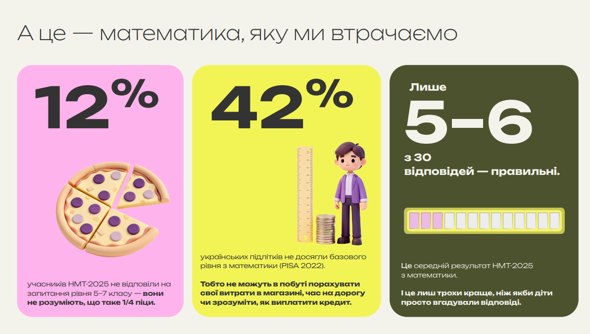 За даними PISA-2022, 42% українських підлітків і підліток не досягають базового рівня математичної грамотності. Це означає, що вони мають труднощі з елементарними повсякденними розрахунками: плануванням витрат, визначенням часу в дорозі або аналізом простих числових даних.