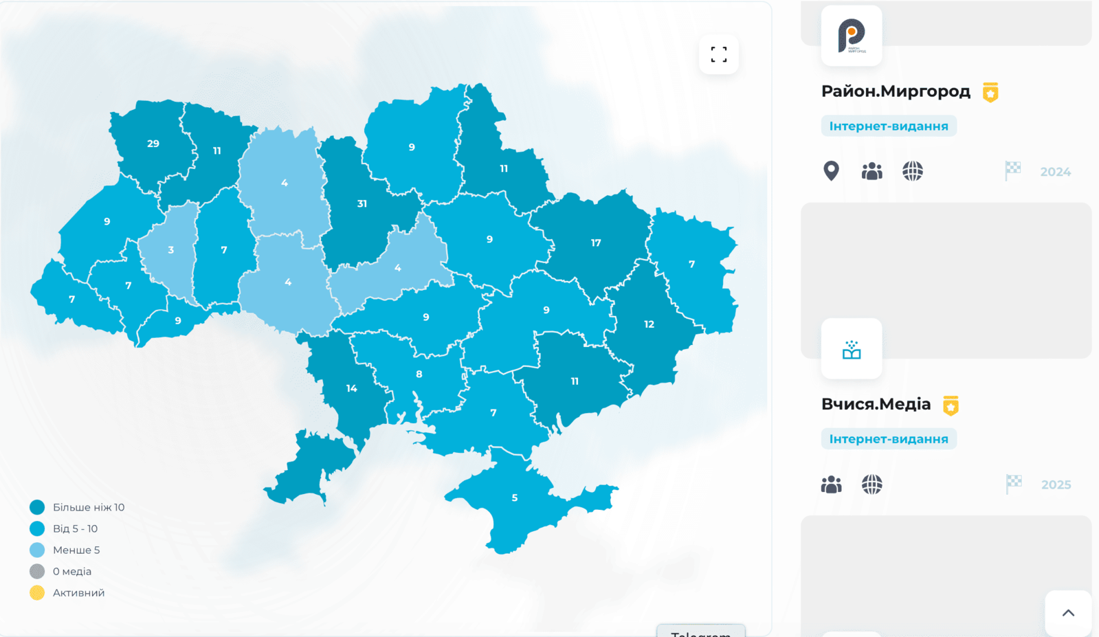 Загалом до мапи увійшли 193 онлайн-медіа, вісім регіональних центрів журналістських розслідувань, 21 радіо та 31 телеканал з усіх областей України. Найбільше рекомендованих медіа зафіксували у Києві та Київській області — 31 ресурс. Серед лідерів також Волинська область (29), Харківська (17), Одеська (14) та Донецька (12). До переліку потрапили й медіа з тимчасово окупованих територій — п’ять редакцій створюють контент про Крим.