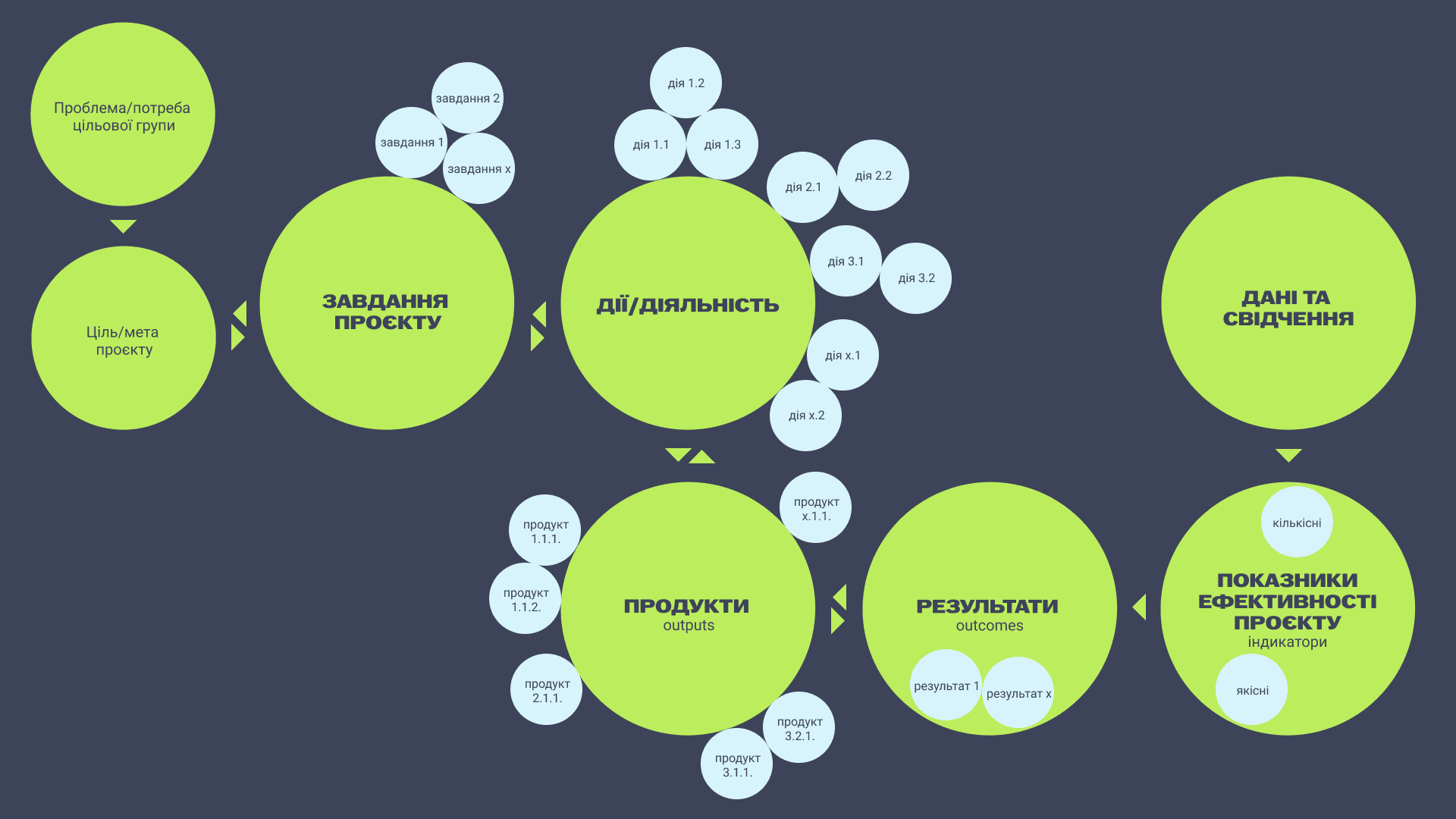 - Результат та сталість: що ви отримаєте наприкінці (індикатори) і як воно житиме після проєкту?