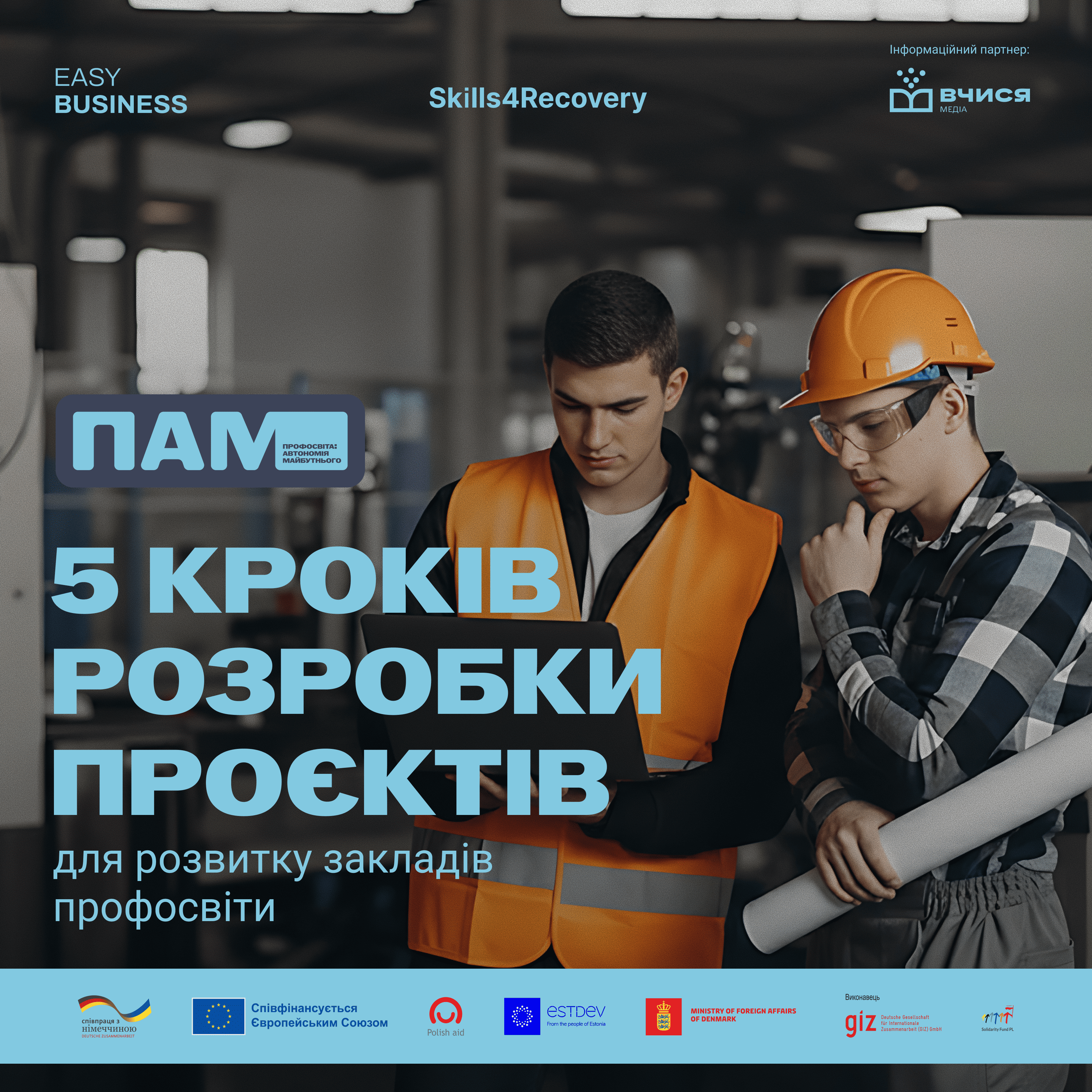 [Проєкт «Профосвіта: Автономія Майбутнього» впроваджує ГО «EasyBusiness» за фінансової підтримки Європейського Союзу, Німеччини, Польщі, Естонії та Данії в межах Мультидонорської ініціативи Skills4Recovery, яку реалізує Deutsche Gesellschaft für Internationale Zusammenarbeit (GIZ Ukraine) GmbH та Solidarity Fund PL in Ukraine (SFPL)].