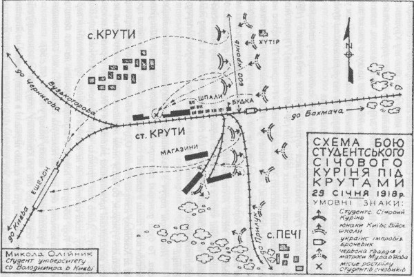 Одначе ті, хто в той час грівся по хатах і поснув, не знали про той наказ, хоч і для них через зв’язкових був поданий наказ іти в бік ешелону. Уся відповідальність прикриття відступу припала тепер гармашам сотника Лощенка і юнакам кулеметникам, що були тепло одягнені, а головне загартовані в боях. Уже поїзд рушив помалу, а все ще до поїзду бігли юнаки і студенти, несучи поранених… Наш ешелон відступив зі станції Крути вже тоді, коли Муравйовський панцерник в’їжджав на станцію. Ті, хто спав по хатах, були збуджені селянами й побігли на станцію на світло, не знаючи, що там уже ворог. І тепер зав’язався бій на життя і смерть».