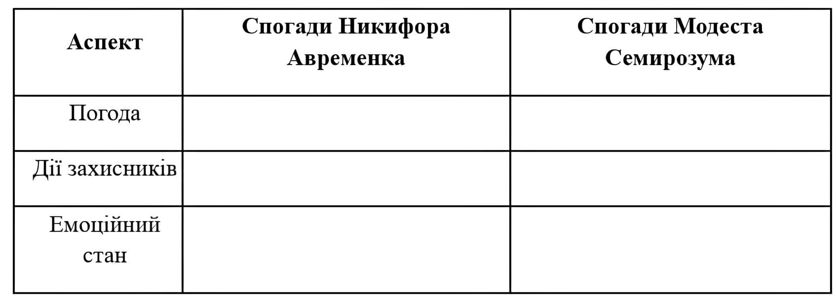 - Порівняйте, як обидва автори описують погодні умови. Чи однакові їхні оцінки? Які нові деталі додає кожен із них? Складіть таблицю за зразком: