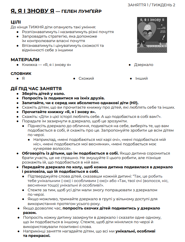 - під час нього вихователь/ка читає дітям одну історію, у якій головні герой чи героїня стикаються з життєвими ситуаціями, що потребують використання соціально-емоційних навичок. Ці історії релевантні дитячому досвіду;