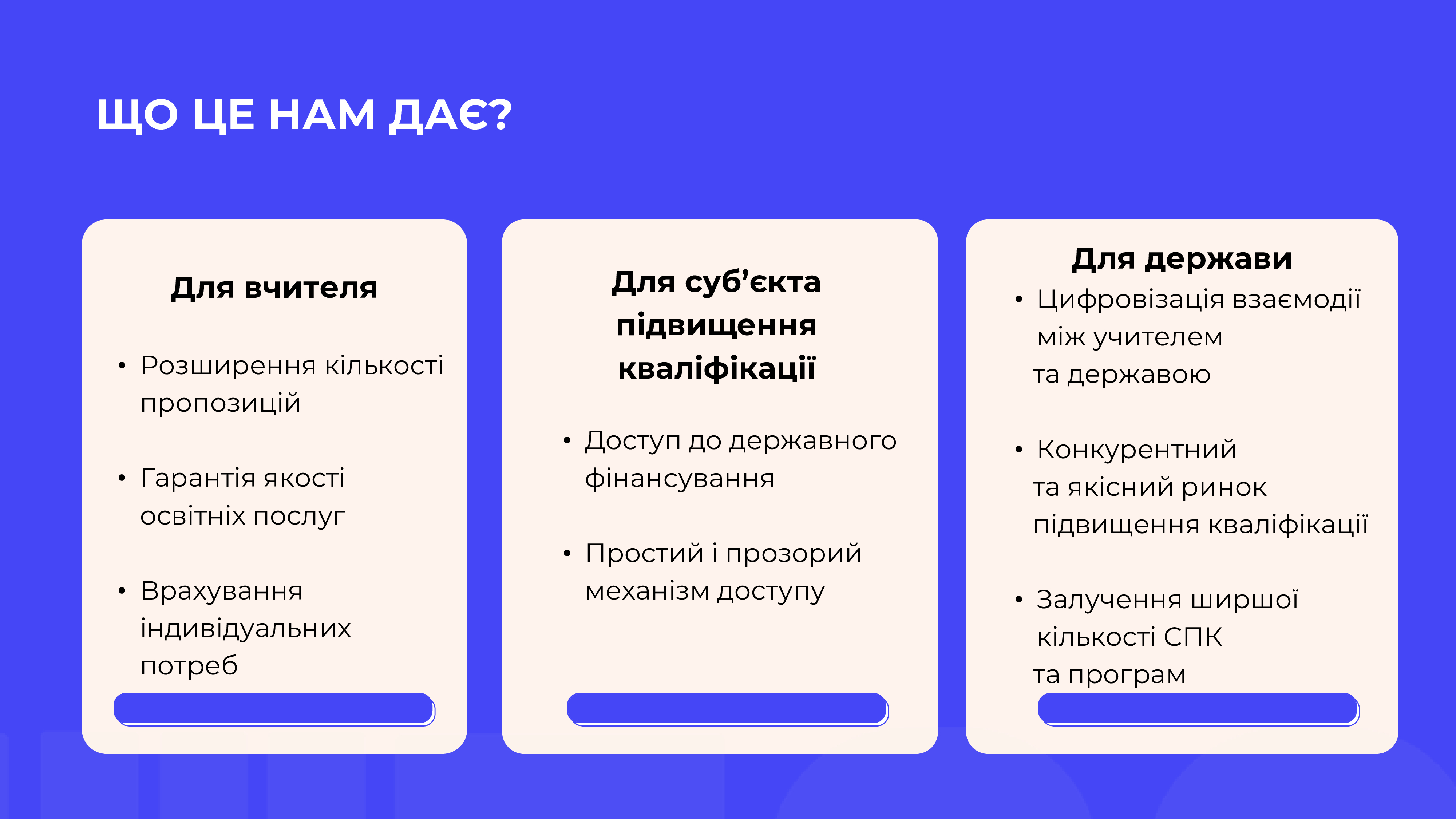 Усе це частина політики Міністерства освіти і науки «Гроші ходять за вчителем», яка має зробити професійний розвиток педагогічних і науково-педагогічних працівників та працівниць зручнішим і прозорішим.
