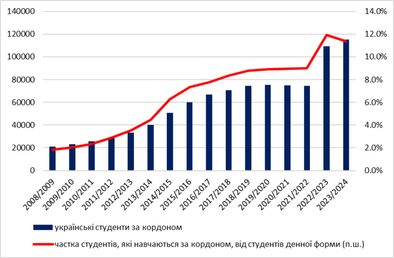 До початку широкомасштабної війни частка тих, хто навчався за межами країни, становила 9 %, у 2022 році цей показник виріс до 11,9 %, а в 2023 дещо зменшився — до 11,4 %. Фактично кожен десятий вступник вирішує навчатися не в Україні. І це при тому, що загальна кількість вступників і вступниць у нас доволі висока.