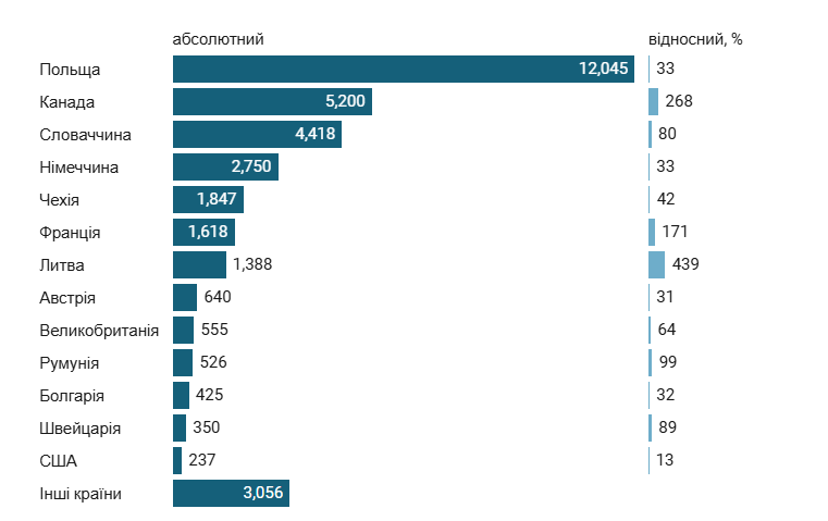 Певне зростання також помітне в Чехії, яка пішла шляхом Словаччини. Ще один яскравий приклад — Канада. Там справжній стрибок стався після початку широкомасштабної війни (у п’ять разів).