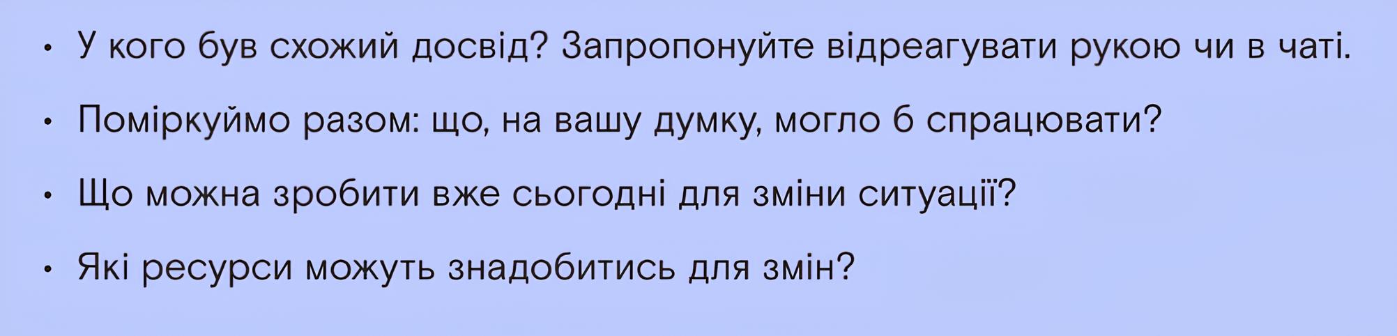 - Використовувати фрази на кшталт: «Дякую, що поділилися цією історією. Вона дуже цінна для нашого обговорення».