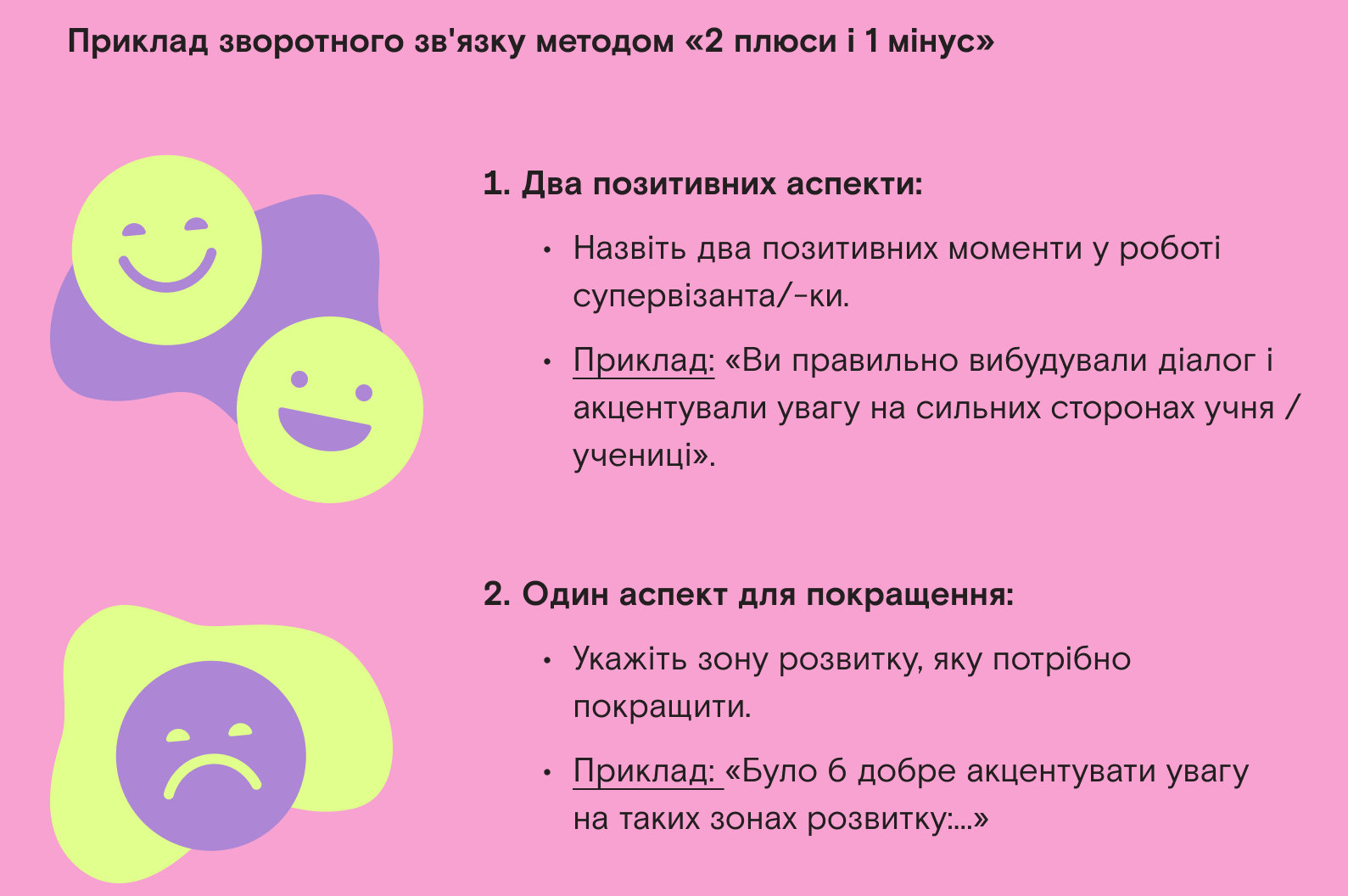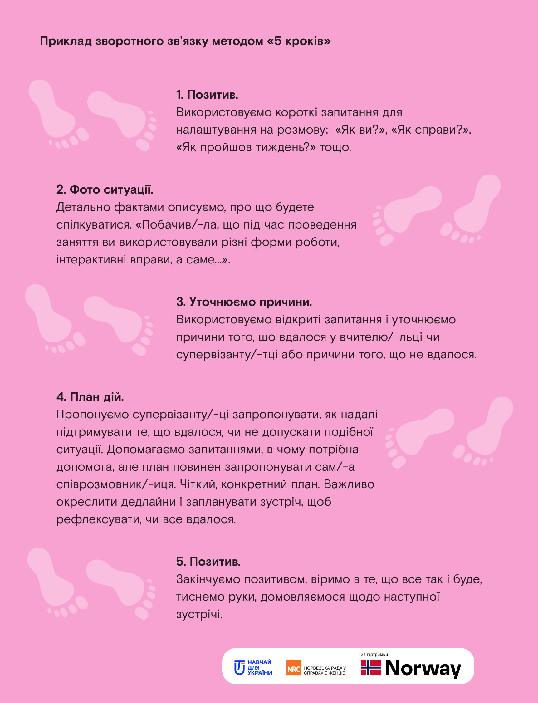 - Надавати зворотний зв’язок одразу після спостереження за заняттям, щоб учитель чи вчителька міг / могла відразу внести корективи у свою роботу.