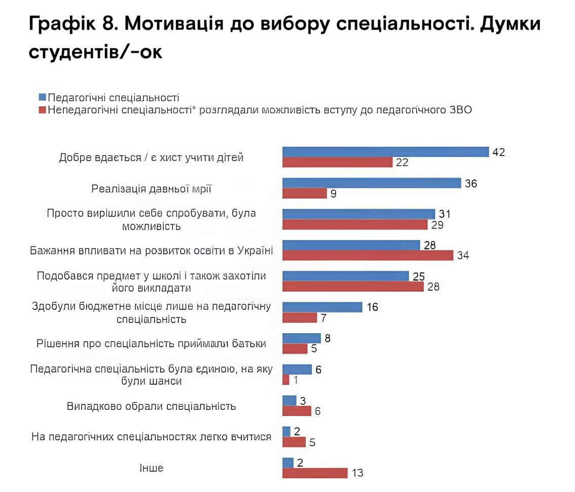 Дослідження показало, що найчастіше студенти та студентки педагогічних спеціальностей обирають учителювання із ціннісних та альтруїстичних міркувань. Серед найпоширеніших причин вступу до педагогічних закладів вищої освіти респонденти/ки називали: