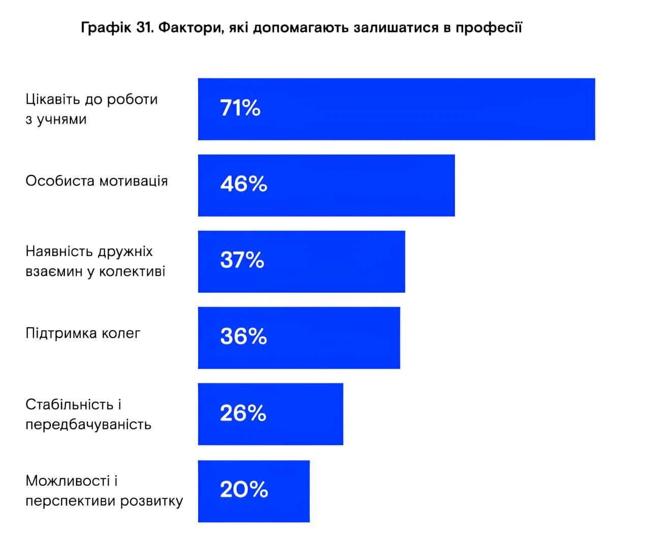 Водночас учителі/ки з досвідом до п’яти років залишаються в професії через інтерес до роботи з учнівством. Головним чинником утримання в професії більшість (71 %) назвала саме роботу з дітьми, тоді як перспективи розвитку згадали 20 %.