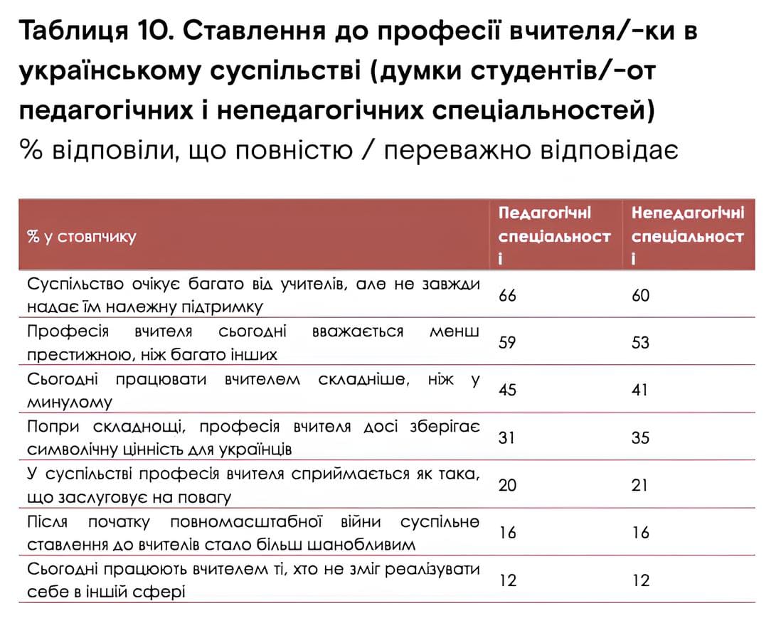 - 24 % студентів/ок педагогічних і 25 % студентів/ок непедагогічних спеціальностей вважають, що професія вчителя посідає високі або дуже високі щаблі в суспільстві.