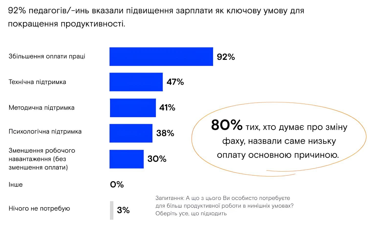 - 92 % педагогів/инь вважають підвищення зарплати ключовою умовою для покращення продуктивності роботи;