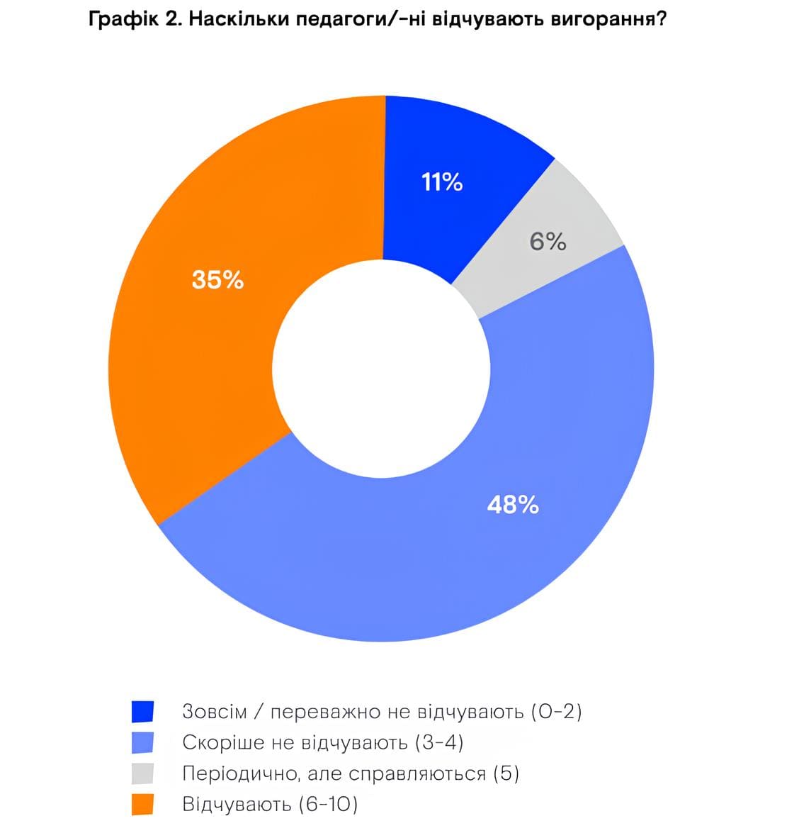 Наприклад, 35 % респондентів/ок з-поміж педагогів/инь відповіли, що скоріше чи повністю відчувають емоційне вигорання. Ще 48 % зазначили, що періодично відчувають це, хоч стверджують, що ніби справляються. Лише 17 % відповіли, що вони скоріше чи зовсім не відчувають вигорання.