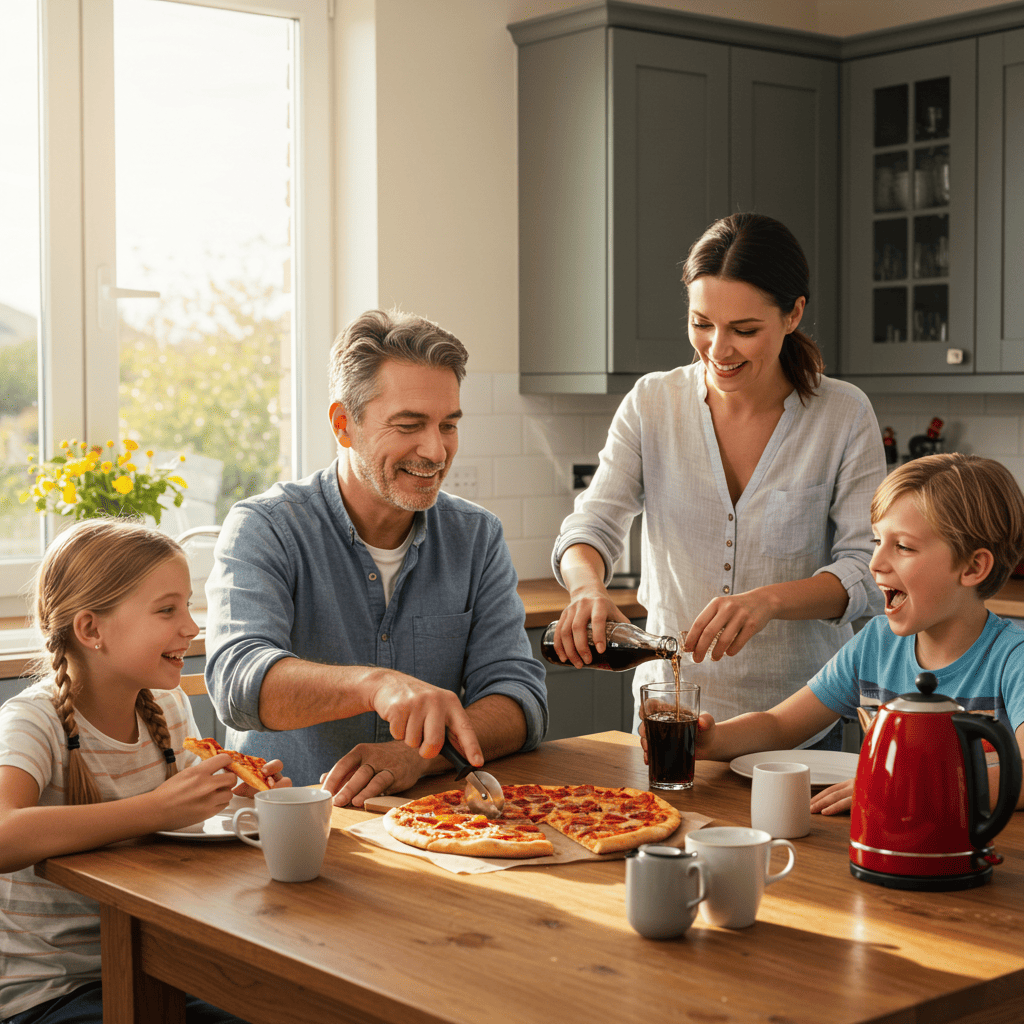 Наприклад, на передньому плані наведеного зображення — чашка з дивним «вирізом» вгорі, у тата пальці на столі лежать неприродно. Шматочок піци, який тримає дівчинка, набагато більший за проміжок, з якого його теоретично могли вийняти. Також ручка на вікні перебуває в режимі «відчинено», хоч саме вікно щільно зачинене.
