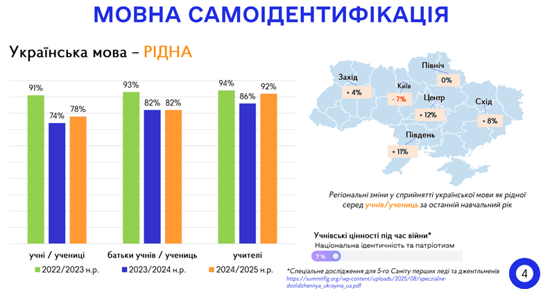— Державна служба якості освіти провела дослідження щодо використання української мови в школах, і це спровокувало хвилю дискусій. ДСЯО зафіксувала домінування російської мови в школах Києва, що стурбувало освітян і батьків. Але якщо аналізувати дані з усієї України, то є відчутна динаміка: українська мова в школах переважає над російською.