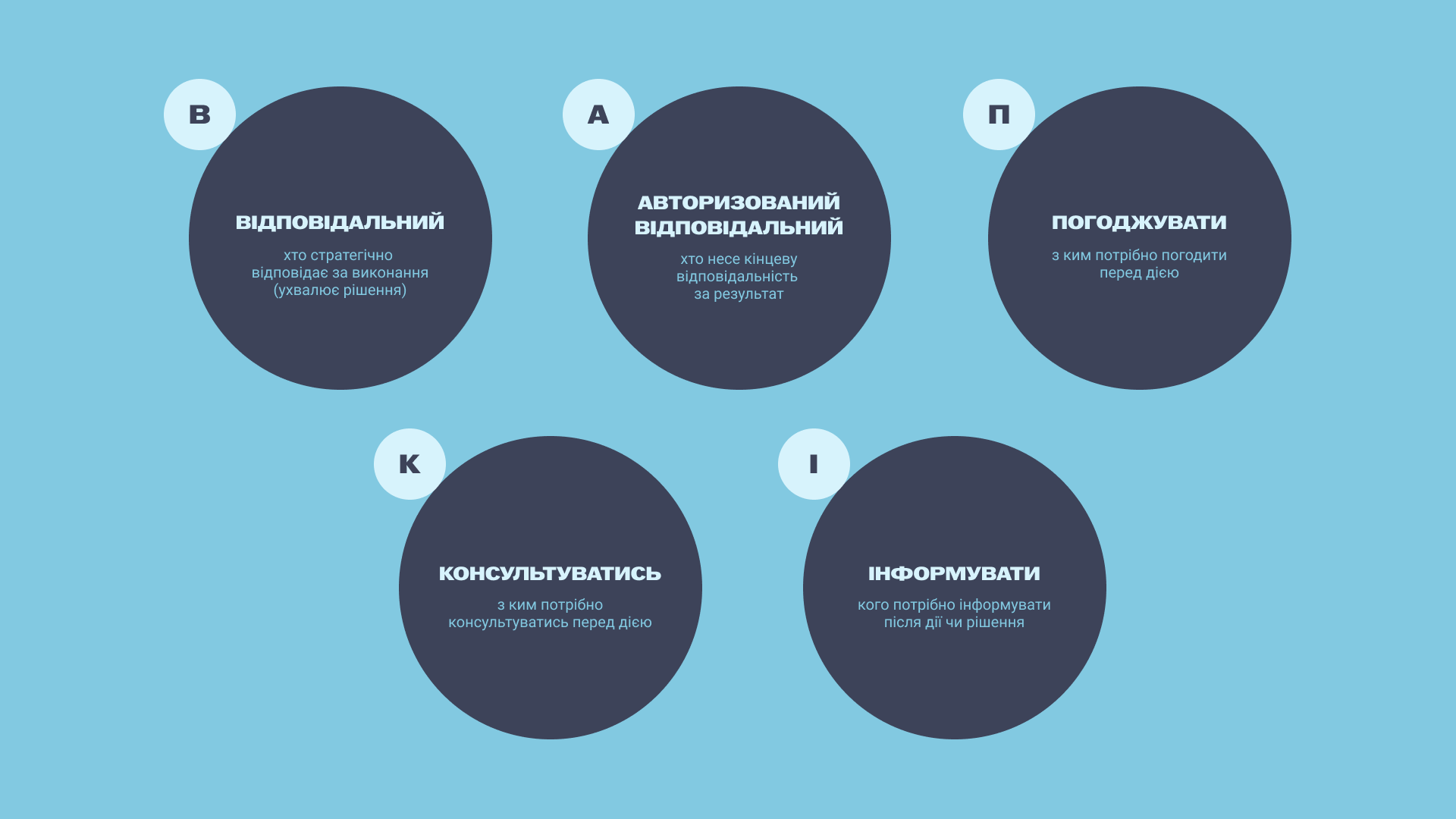 Щоб освітянам та освітянкам було простіше розібратися з ролями цих чотирьох гравців і щоб гравці не заважали один одному, у межах проєкту «Профосвіта: Автономія Майбутнього (ПАМ)» експерти аналітичного центру «EasyBusiness» радять використовувати інструмент — матрицю відповідальності (також відому як RACI). Це інструмент, який візуалізує, хто відповідає, узгоджує, консультує та інформує. Також до цієї матриці можна додати авторизованого відповідального: того, хто несе кінцеву відповідальність за результат.