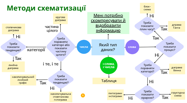 6. Метод схематизації варто використовувати тоді, коли треба скомпресувати й відобразити інформацію. Щоб зрозуміти, яка саме схема потрібна, Василь Терещенко радить поставити питання: «Який тип даних (потрібно схематизувати – ред.)?».