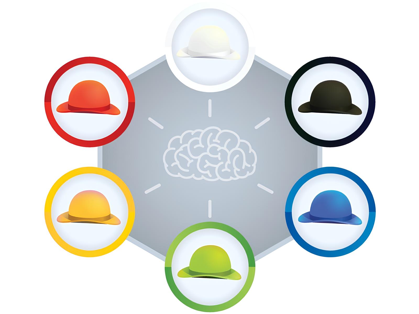 Метод допомагає проаналізувати інформацію з різних позицій і знайти оптимальний варіант розв’язання проблеми. Едвард де Боно, автор підходу, запропонував метафору капелюха, колір якого визначає спосіб роботи з інформацією:
