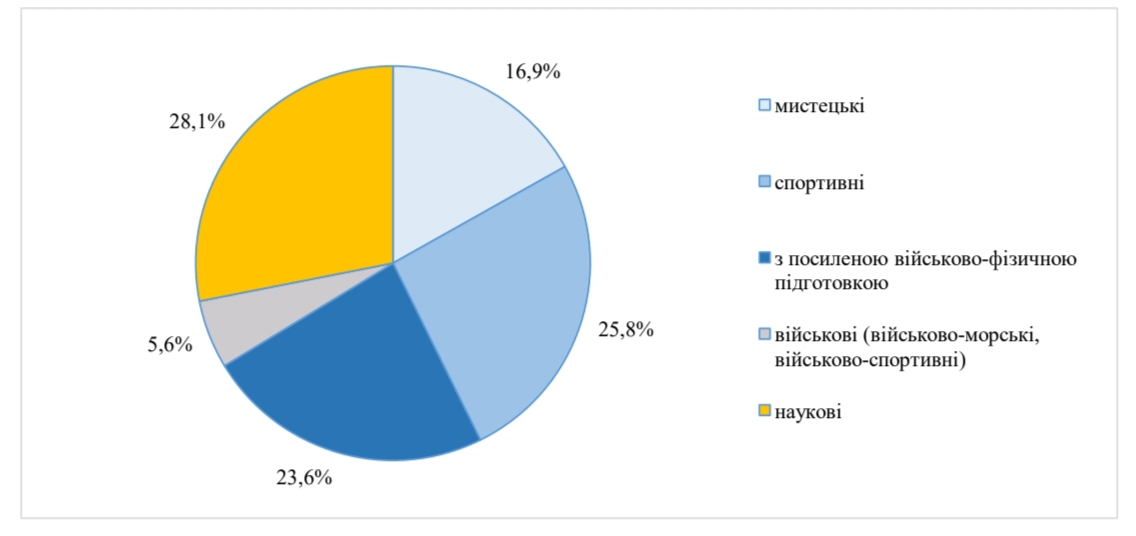 Найпоширеніший тип закладів освіти на початок 2025 року — це ліцеї із початковою школою та гімназією (43,4 %, 5 329 одиниць). 89 із них мали певне тематичне спрямування, наприклад: