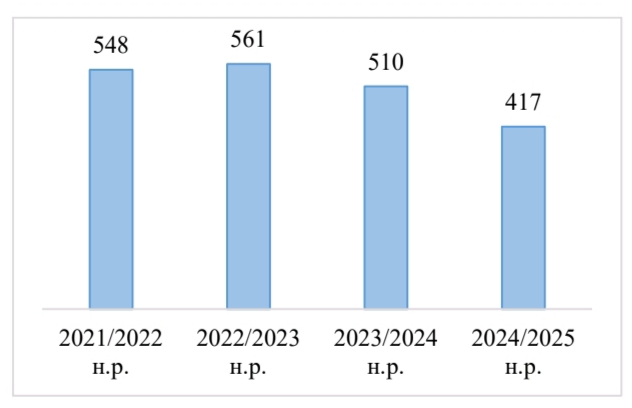 Помітно скоротилася кількість відокремлених початкових шкіл — на 23,9 % за останні чотири роки. Особливо різке зменшення відбулося протягом останнього року — мінус 18,2 %. Якщо у 2021–2022 році таких шкіл було 548, то нині залишилося 417. Це результат як демографічних змін, так і оптимізації освітніх мереж у малих громадах, де утримання малокомплектних шкіл економічно невигідне.