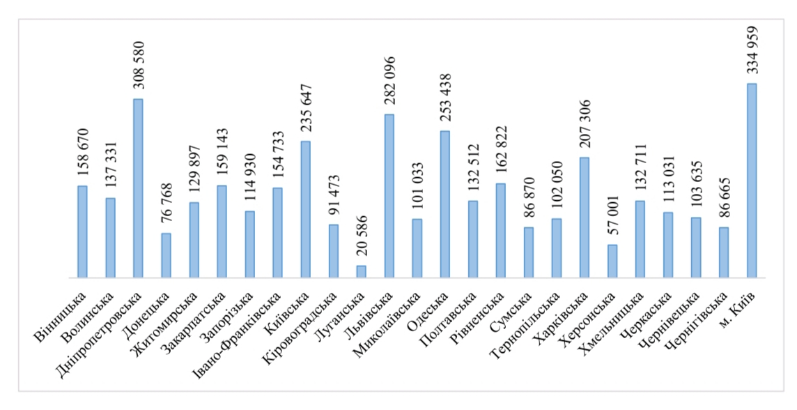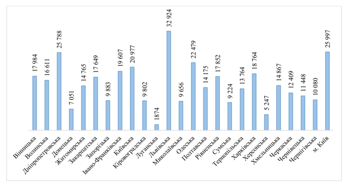 - Львівська область має найбільшу кількість педагогів/инь — 32 924 особи. Це можна пояснити високою концентрацією шкіл та активним прийманням учнівства із прифронтових територій;