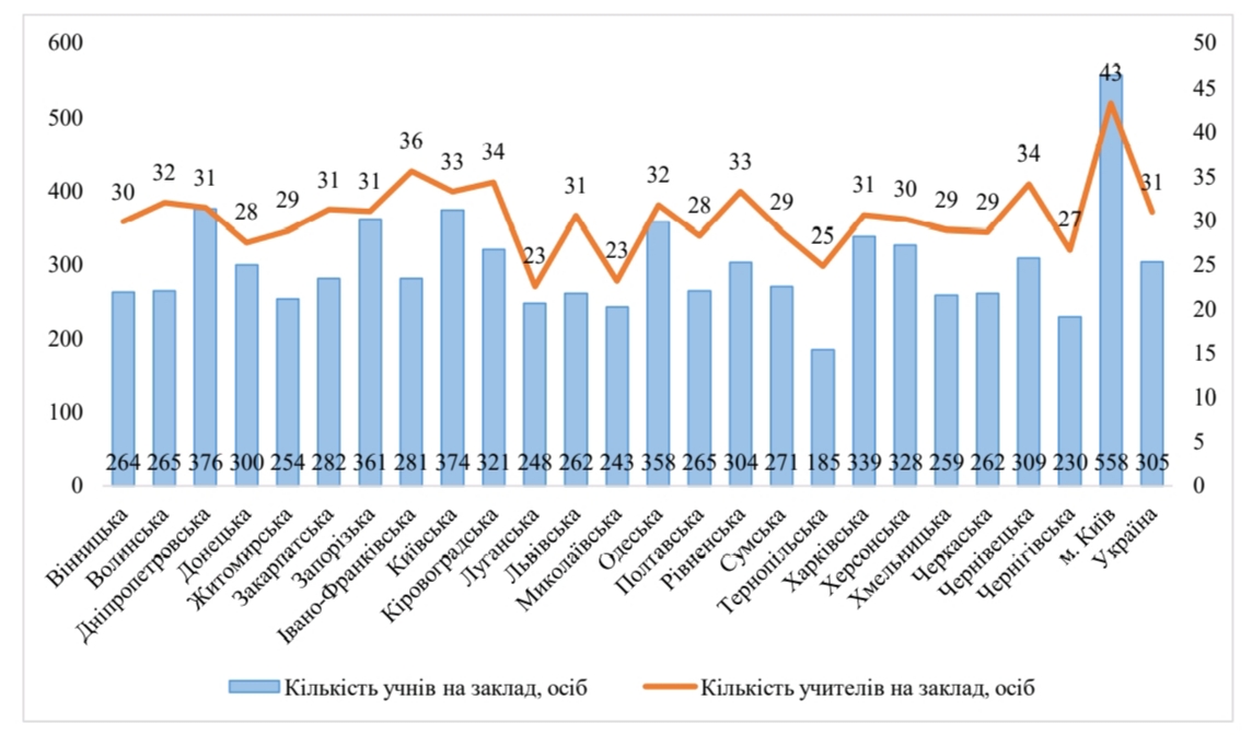 - Луганська та Миколаївська області посідають останні місця за кількістю педагогів/инь на один заклад — у середньому по 23 особи.
